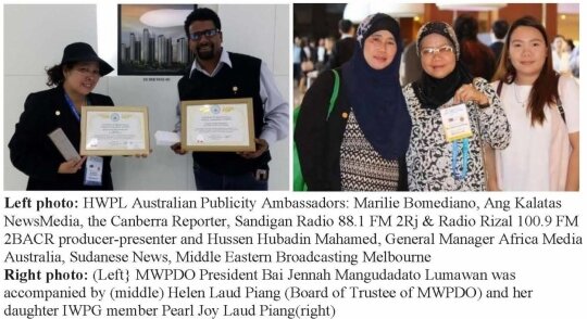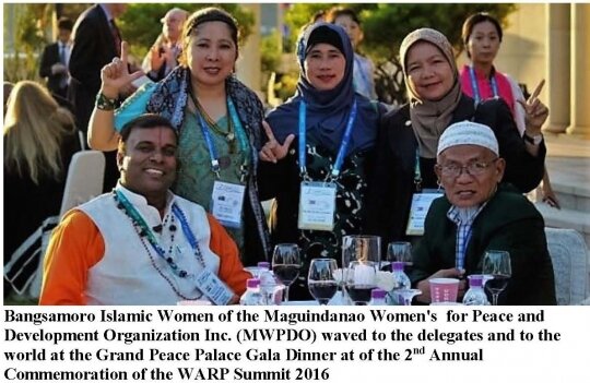 MWPDO President Bai Jennah Mangudadato Lumawan of MWPDO the IWPG was accompanied by Helen Laud Piang (Board of Trustee of MWPDO) and her daughter Pearl Joy Laud Piang (member MWPDO) three of these delegates attended the WARP Summit voluntarily at their own return trip expense to pursue the peace advocacy of their regions.