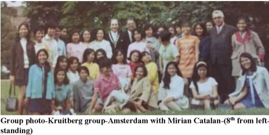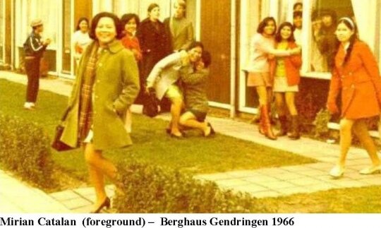 Mirian or also known to the groups as Mommy Catalan or Manang Iyang came to the Netherlands in 1966 as the Social worker for the First Berghaus Gendringen Group, she stayed in Gendringen and after three years she returned to the Philippines, only to return to the Netherlands again on October 29, 1969 this time leading the Berghaus Amsterdam Kruitberg Group. During her stays in the Netherlands she did plenty of travelling with the group. Places like Spain, Rome and Paris are some of them.